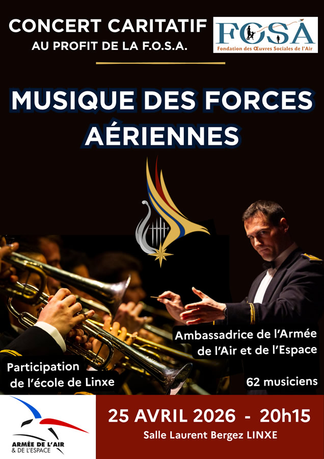 La base aérienne 709 de Cognac-Châteaubernard organise un concert caritatif de la Musique des Forces Aériennes le mercredi 6 mai 2026 à la salle du Castel de Châteaubernard.