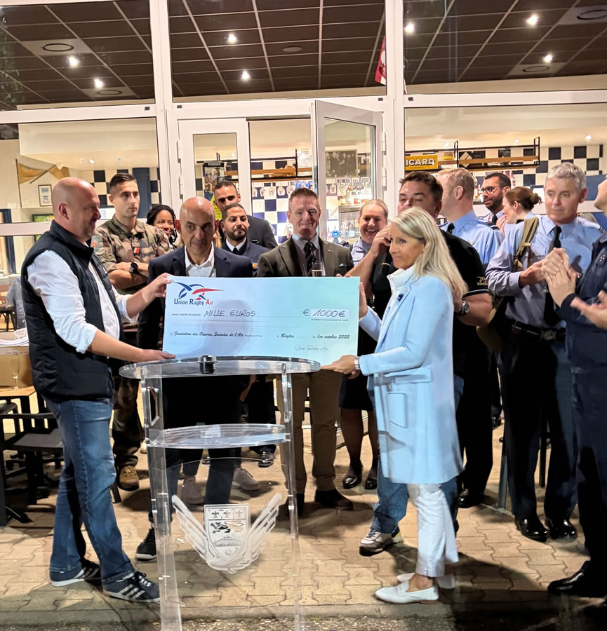 Ce match fût également l’occasion d’organiser une tombola permettant de soutenir la Fondation des Œuvres Sociales de l’Air (FOSA). A cette occasion, notre bénévole Françoise Vignon s’est vu remettre un chèque de 1 000 €.