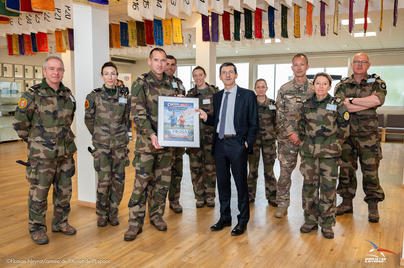 Le mardi 31 mars 2026, une remise de dons a été faite sur la base aérienne 722 de Saintes entre le général (2S) Hervé Chêne, délégué général et directeur des meetings de la FOSA et le Colonel Ghislain Mifurt, commandant de la BA 722.